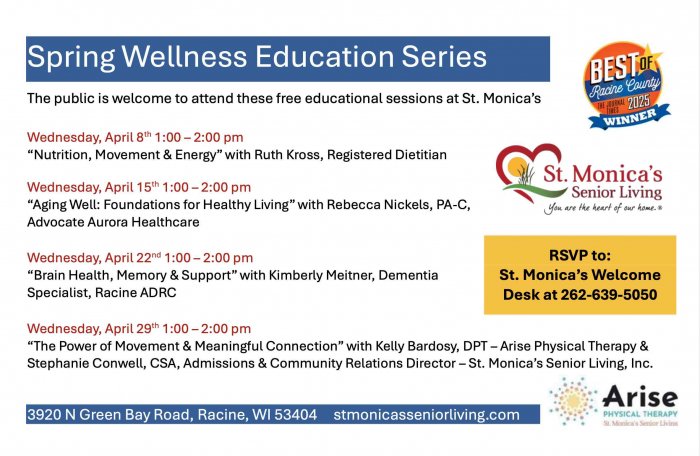 Join Kimberly Meitner, Dementia Specialist from the Racine ADRC, for a vital discussion on "Brain Health, Memory & Support." This session is part of St. Monica's commitment to providing free wellness education to our community. Learn about resources available in Racine County and strategies for cognitive health.